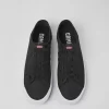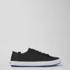 Black textile men’s shoes with elastic laces and rubber outsoles.