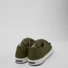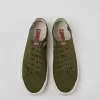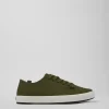 Green textile men’s lace-up sneakers with recycled OrthoLite® footbeds and rubber outsoles.
