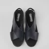 Blue leather women’s cross-strap sandals with comfortable medium-height wedge design, cushioned PU footbeds and extra-lightweight EVA outsoles.