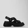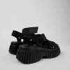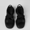 Black women’s cross-strap sandals with recycled polyester, EVA footbeds and 100% EVA outsoles.