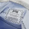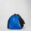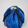 Blue and white shopper made from 100% nylon repurposed sails with black cotton webbing straps and adjustable rope fastenings.