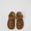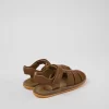 Brown leather kids’ sandals with hook-and-loop closures and rubber outsoles.