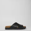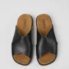 Black leather women’s cross-strap sandals with cushioning PU footbeds and 100% EVA outsoles.
