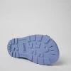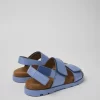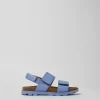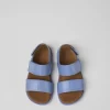 Blue leather kids’ 2-strap sandals with hook-and-loop closures, EVA footbeds and 100% rubber outsoles.