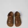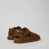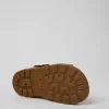 Brown leather kids’ sandals with EVA footbeds and 100% rubber outsoles.