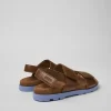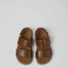 Brown leather kids’ 2-strap sandals with hook-and-loop closures, EVA footbeds and 100% rubber outsoles.