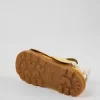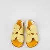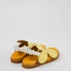 Yellow and brown leather and textile kids’ sandals with oversized flower cut-out, OrthoLite® Recycled™ non-removable footbeds, and rubber outsoles.
