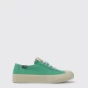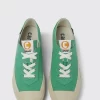 Green 100% recycled cotton women’s sneakers with 23% recycled rubber and 40% natural rubber outsoles.
