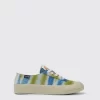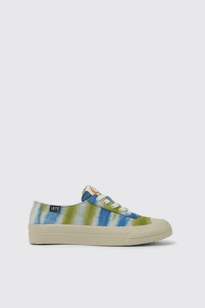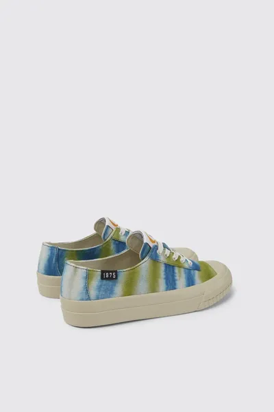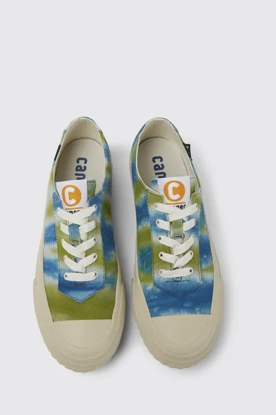 Multicolored 100% organic cotton women’s sneakers with tie-dye textile uppers made in collaboration with the Ethical Fashion Initiative. 23% recycled rubber and 40% natural rubber outsoles.