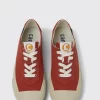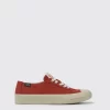 Red 100% recycled cotton women’s sneakers with 23% recycled rubber and 40% natural rubber outsoles.