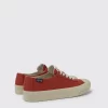Red 100% recycled cotton women’s sneakers with 23% recycled rubber and 40% natural rubber outsoles.
