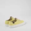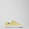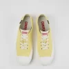 Yellow recycled cotton women’s sneakers with OrthoLite® Recycled™ removable footbeds and rubber outsoles (40% natural, 23% recycled).