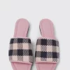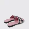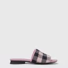 Pink and black recycled cotton and leather women’s sandals with 100% TPU outsoles (20% recycled).