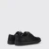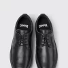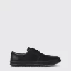 Black calfskin shoes for men with removable OrthoLite® Recycled™ footbeds and rubber outsoles.