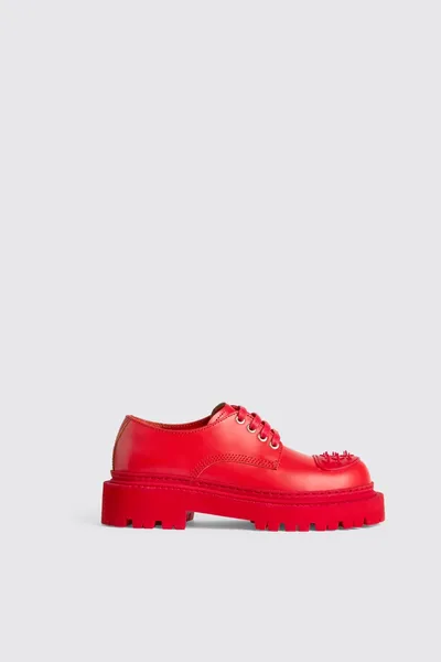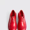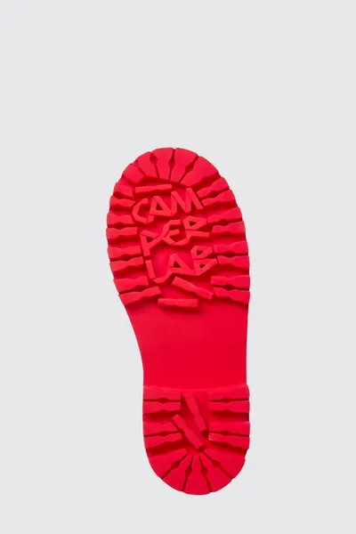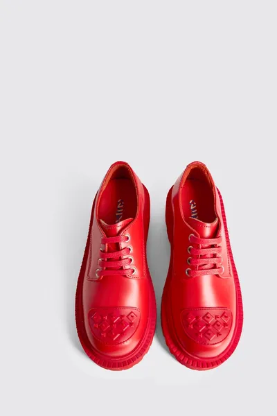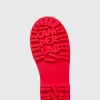 Red leather shoes with chunky outsole and rubber toe cap detail.