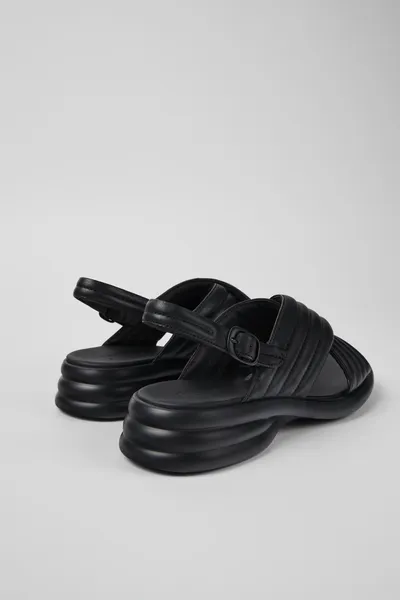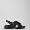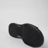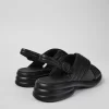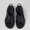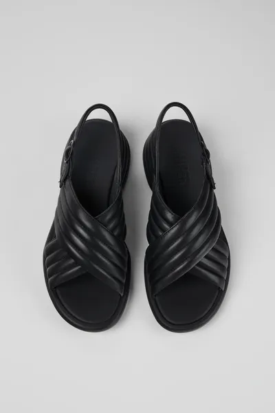 Black women’s cross-strap sandals with water-saving leather, leather linings, recycled OrthoLite® footbeds, and 100% EVA outsoles.