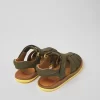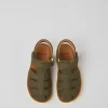 Green leather kids’ sandals with a hook-and-loop closing system and rubber outsoles (20% recycled).