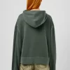 Green hoodie in 100% mineral-dyed organic cotton, using 80% less water on average than standard cotton.
