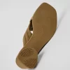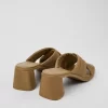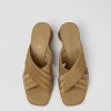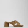 Brown textile women’s cross-strap sandals with recycled OrthoLite® footbeds and rubber & ABS outsoles.