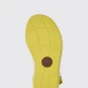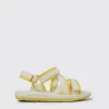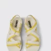 White and yellow women’s sandals with 100% recycled PET straps, EVA outsoles, and a hook-and-loop closing system.