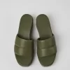 Green leather women’s sandals with non-removable PU footbeds and PU outsoles.