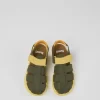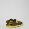 Green and yellow leather kids’ sandals with a hook-and-loop closing system and EVA outsoles.