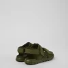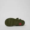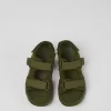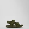 Green textile kids’ 2-strap sandals with water-friendly recycled PET Neoprene, hook-and-loop closures, cushioning EVA footbeds and 100% EVA outsoles.