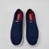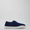 Blue recycled PET men’s shoes with OrthoLite® Recycled™ footbeds, elastic laces, and EVA outsoles (20% recycled).
