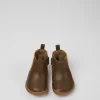 Brown and yellow leather kids’ boots with rubber outsoles (20% recycled).