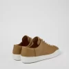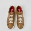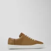 Brown leather men’s sneakers with elastic laces, cushioning recycled OrthoLite® footbeds, and EVA outsoles.