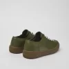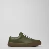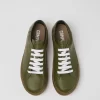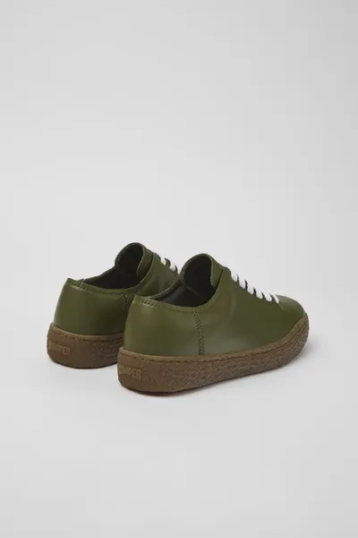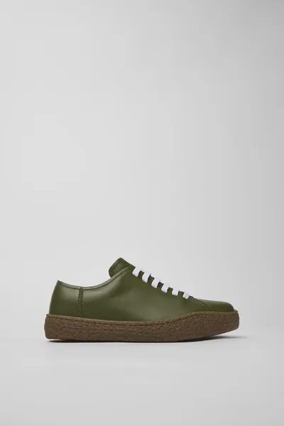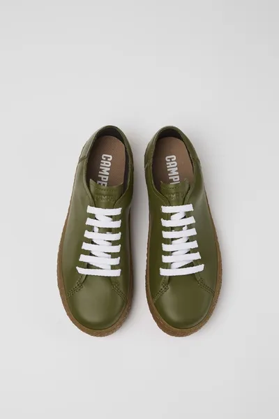 Green leather women’s sneakers with recycled polyester linings, recycled OrthoLite® footbeds, and 100% rubber outsoles.