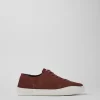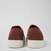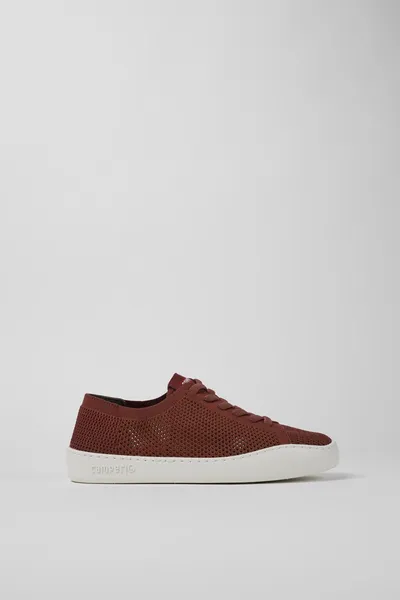 Red women’s sneakers with recycled polyester one-piece knit, elastic laces, recycled OrthoLite® footbeds, and EVA outsoles.