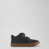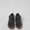 Blue leather and textile kids’ sneakers with hook-and-loop closing system, OrthoLite® Recycled™ removable footbeds, and rubber outsoles.