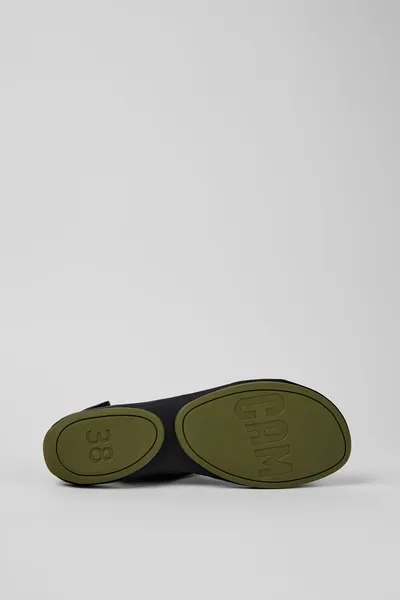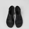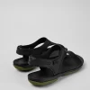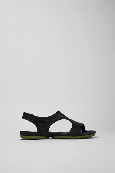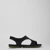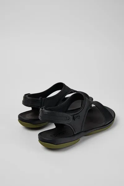 Black leather women’s sandals with leather linings, PU footbeds, and rubber outsoles.