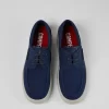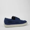 Blue men’s boat shoes with recycled cotton and leather details, cushioning recycled OrthoLite® footbeds, and XL EXTRALIGHT® EVA outsoles.