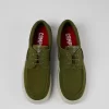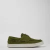 Green men’s boat shoes with recycled cotton and leather details, cushioning recycled OrthoLite® footbeds, and XL EXTRALIGHT® EVA outsoles.