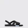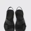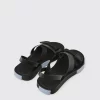 Black leather and recycled PET webbing men’s sandals with EVA and rubber outsoles (20% recycled) and hook-and-loop closing system.