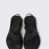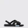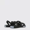 Black leather and recycled PET webbing women’s sandals with EVA and rubber outsoles (20% recycled) and a hook-and-loop closing system.