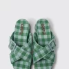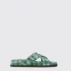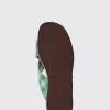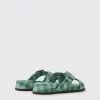 Blue and green recycled PET and recycled cotton women’s sandals with 100% rubber outsoles.