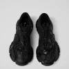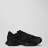 Black sneakers with Sorona® mesh, HyphaLite™ and MIRUM® uppers, TENCEL™ Lyocell laces, OrthoLite® Recycled™ footbeds, sugarcane EVA midsoles, and rubber outsoles.