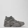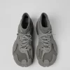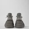 Grey caged sneakers with water-repellent 3D-knitted PET sock interior, made using Direct Bonding Technology, and recycled PU & TPU outsoles. Fully recyclable.