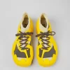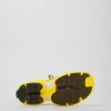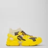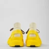 Yellow caged sneakers with water-repellent 3D-knitted PET sock interiors, direct injection TPU exteriors, and recycled PU outsoles. Fully recyclable.
