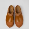 Brown vulcanized leather clogs with slingback straps and toothed rubber outsoles.