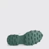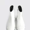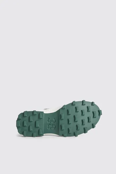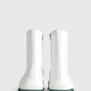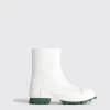 Vulcanized white leather zip boots with green toothed rubber outsoles.