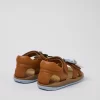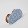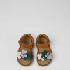 Brown leather kids’ sandals with flower detail, a hook-and-loop closing system, and rubber outsoles (20% recycled).