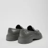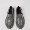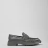 Gray leather women’s loafers with OrthoLite® Recycled™ removable footbeds and rubber outsoles.