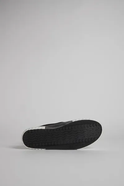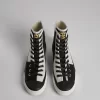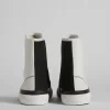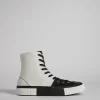 Vulcanized black and white cotton canvas high-top sneakers with asymmetric design.