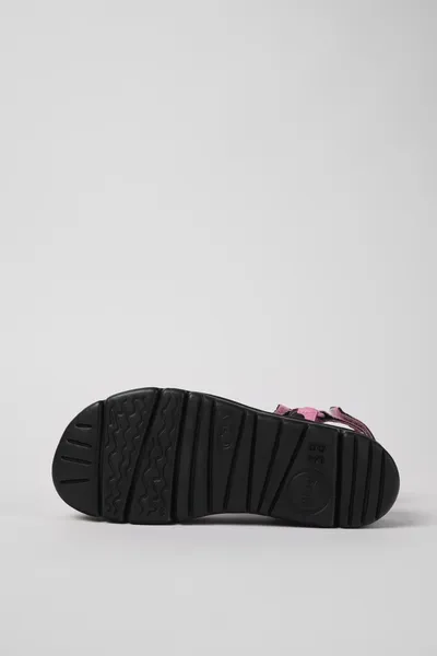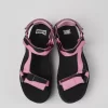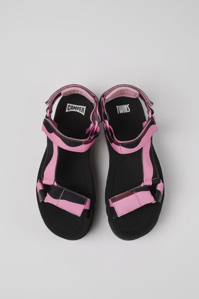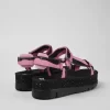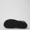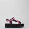 Multicolored textile women’s sandals with recycled polyester webbings and linings, and XL EXTRALIGHT® EVA outsoles.