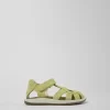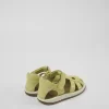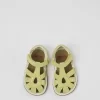 Yellow nubuck kids’ sandals with hook-and-loop closures, chrome-free leather-lined footbeds and rubber outsoles.
